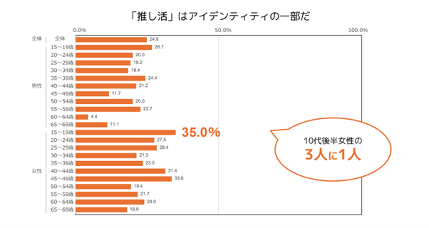 実際に、「推し活は自身の一部、アイデンティティだ」と感じている人々の割合は全体の約25%、10代女性では35%にのぼり、3人に1人が推し活を自身のアイデンティティのひとつとして捉えていることが分かります。さらに注目すべき年代は40代女性。30%以上の方が推し活はアイデンティティのひとつであると回答しています。