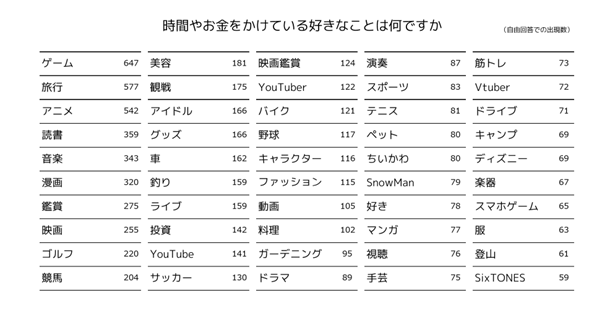 回答として、「ゲーム」「旅行」「アニメ」「読書」「音楽」「漫画」が高い割合を占め、「アイドル」「ライブ」「YouTuber」「キャラクター」などの回答が続きます。