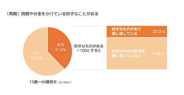 「好きなもの(こと)」がある人のなかで「推し活」をしていると回答した割合は全体の約27%を占めており、3人に1人が「推し活」として好きなもの(こと)を楽しんでいるという結果になりました。