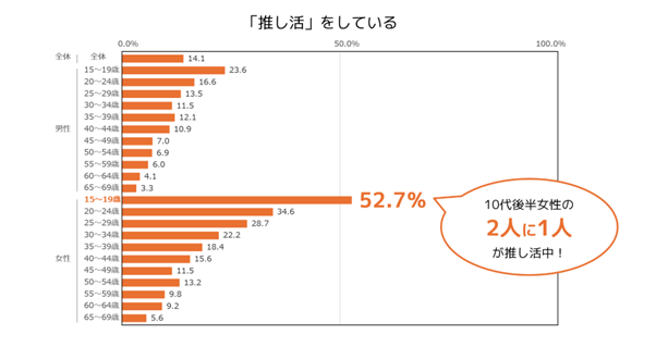 さらに驚くべきことに、10代後半の女性の50%超、つまり2人に1人は推し活をしていることが分かりました。また10代~30代女性では3人に1人、男女全体でも約4人に1人が推し活をしていると回答しています。推し活をしていない人の方が少数派ともいえる時代が到来しています。