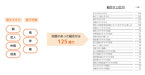今回、「推しに抱く感情」と「推しを推す方法」で回答があった組合せはなんと125通り。