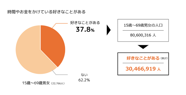 「時間や手間やお金をかけている好きなことがある」にYESと答えた割合は、回答者全体の37.8%、日本人口に当てはめると3,000万人以上という結果になりました。