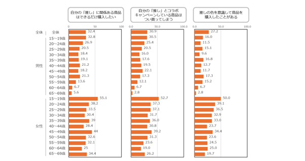 推し活から生まれる消費は、先程紹介した「推しに関連する商品」の購入だけでなく、「推しを起用したキャンペーン商品」や「推し色を意識した商品」に強い購買意欲を持っていることが分かりました。