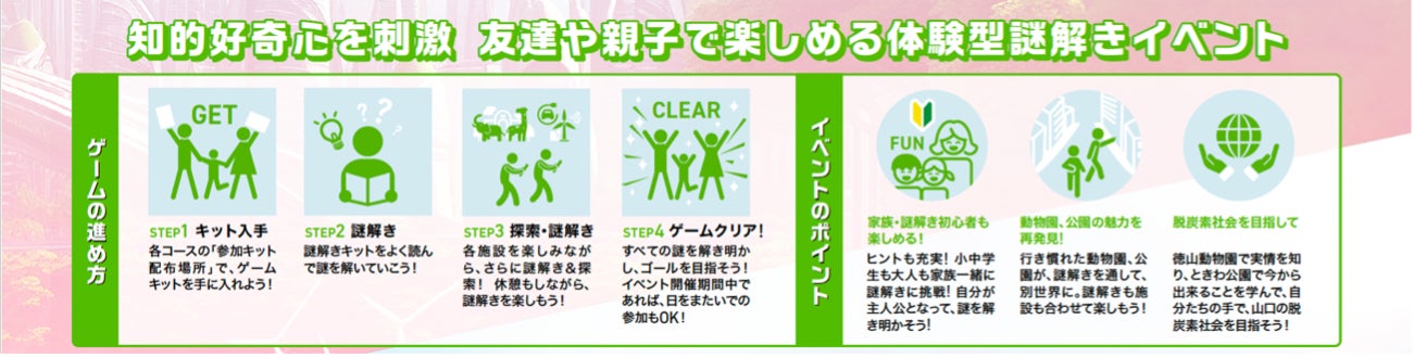 本イベントでは、地球温暖化の実情と、未来の山口のためにこれから自分たちができることを知っていただくことを目的に、2コースの謎解きゲームを制作。まず9/27よりスタートする、周南市徳山動物園では、地球温暖化と実際に動物園で暮らす動物たちへの影響を知る謎解きコース「失われる自然編」。そして10/25よりスタートする、ときわ公園(宇部市)では、未来のエネルギーと自分たちが普段の生活で実践出来ることを知る謎解きコース「未来の生命源編」とし、ファミリーの皆様から謎解き好きの皆様にも楽しみながら知っていただける謎解きイベントを開催します。