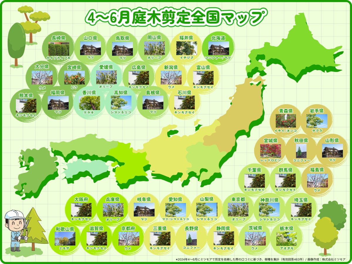 オンラインで見積もり比較・受発注ができるサービス「ミツモア」を運営する株式会社ミツモア(本社:東京都中央区、代表取締役:石川 彩子)は、4〜6月にミツモアで剪定依頼をした方の口コミをもとに、地域ごとの剪定樹種の傾向を分析しました。