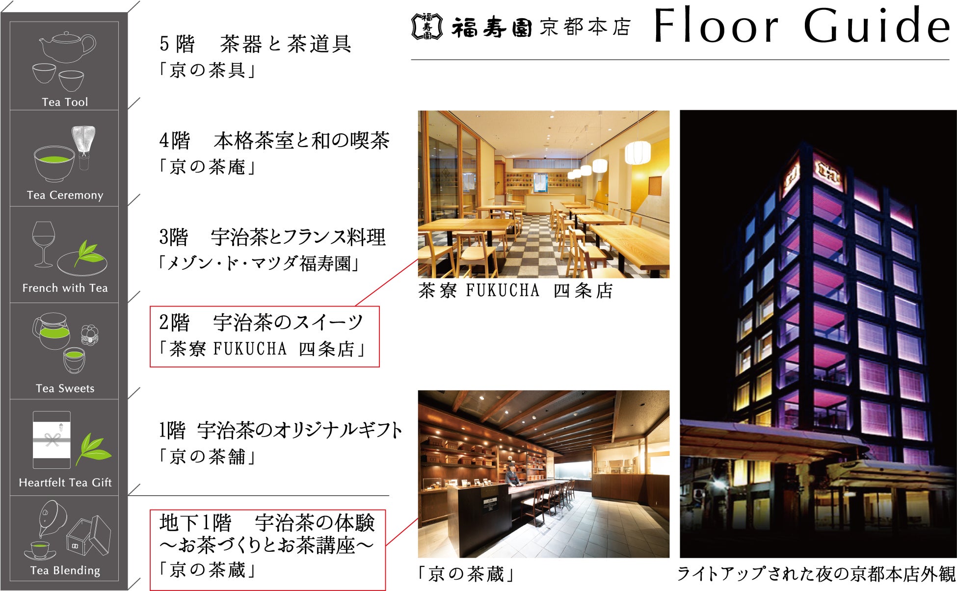 福寿園京都本店は、地下1階~9階の建物で、京都の王朝文化と宇治茶を融合させた設えの中、お茶に関する様々な体験をご提供しています。地下1階「京の茶蔵」では、日本茶インストラクターが常駐しており、お茶について学ぶ講座とお好みのお茶づくり体験をお楽しみいただけます。