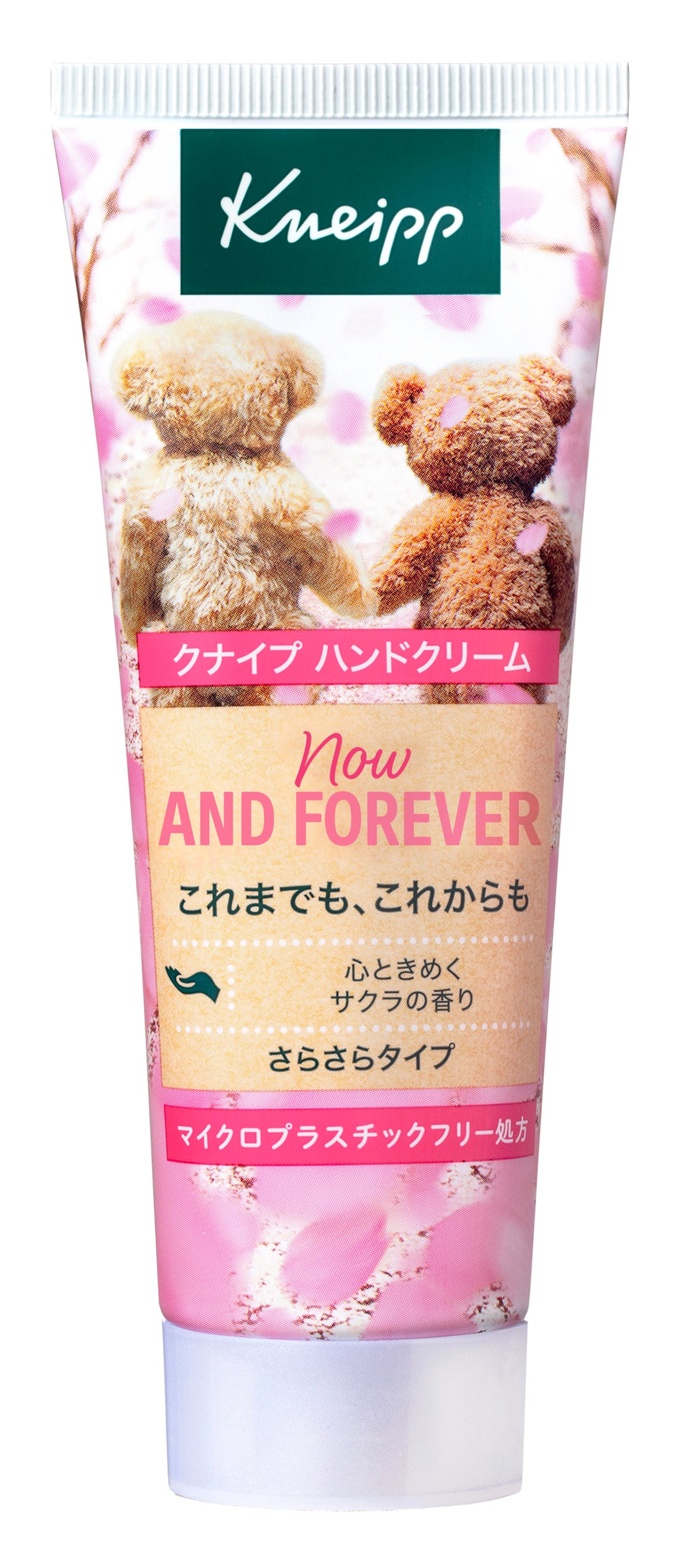 今回、クマのモチーフが大きくなり、より可愛らしいパッケージにリニューアルされました。テクスチャーにもこだわり、しっとり潤うのにベタつかないさらさらの使用感。桜から抽出したヤマザクラ花エキスとアーモンドオイル(*1)の天然美容保湿成分配合で、花びらのようにみずみずしく潤った手肌へと導きます。