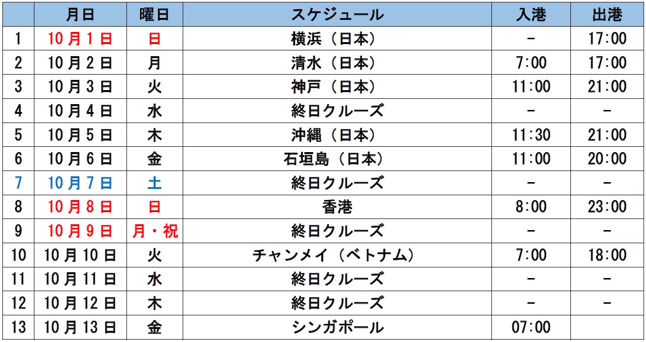 ②2023/10/1出航 日本・沖縄・香港・ベトナム周遊クルーズ12泊13日