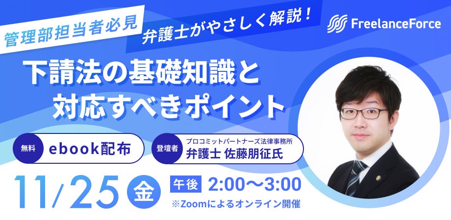 今回のセミナーでは、プロコミットパートナーズ法律事務所 / 佐藤朋征氏をお迎えし、下請法の基礎知識に加え、下請法上企業が遵守すべき適正な発注の形式やその管理方法について、管理部門の担当者が押さえておきたいポイントをわかりやすく解説いたします。