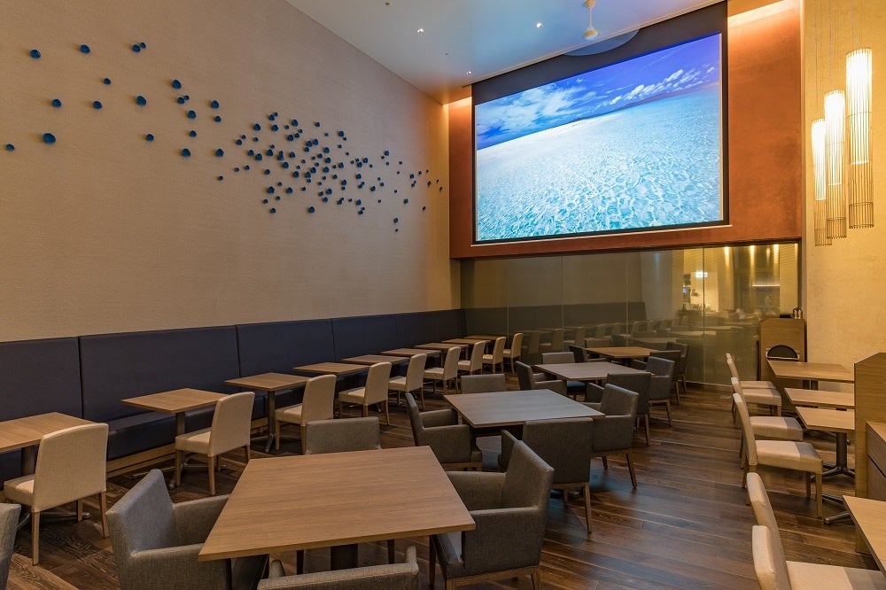店内には、最大12名までご利用いただけるプライベート個室を完備し、ホール席には400インチの大型スクリーンを設置。プライベートな会食はもちろん、貸切パーティーなど多彩なシーンでご利用いただけます。ホワイトとオーシャンブルーを基調とした洗練されたインテリアは、モーニングには爽やかな自然空間を演出し、ディナータイムには沖縄の海のような上品な雰囲気へと変化します。