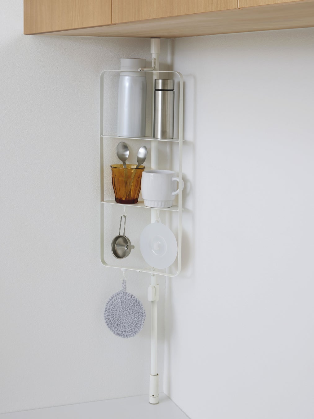 洗面台下やシンク下をスッキリ整頓。ご自宅に設置したつっぱり棒の幅や用途に合わせて、4種類のアクセサリーから置き方のバリエーションを選択できます。さらにアクセサリーの底面には、つっぱり棒にフィットする窪みがあるため、落下するリスクを軽減し、自分のスタイルに合わせた使い分けが可能です。
