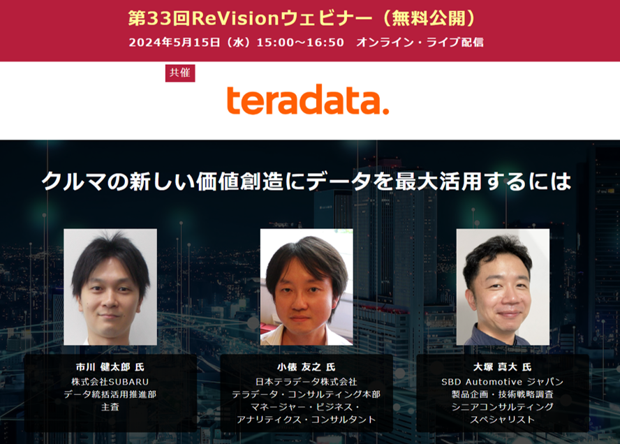 【無料WEBセミナー】SUBARU、日本テラデータ、SBD Automotive ジャパンから講師を迎え、「クルマの新しい価値創造へデータの最大活用」について無料ライブ配信 ― 5月15日(水)