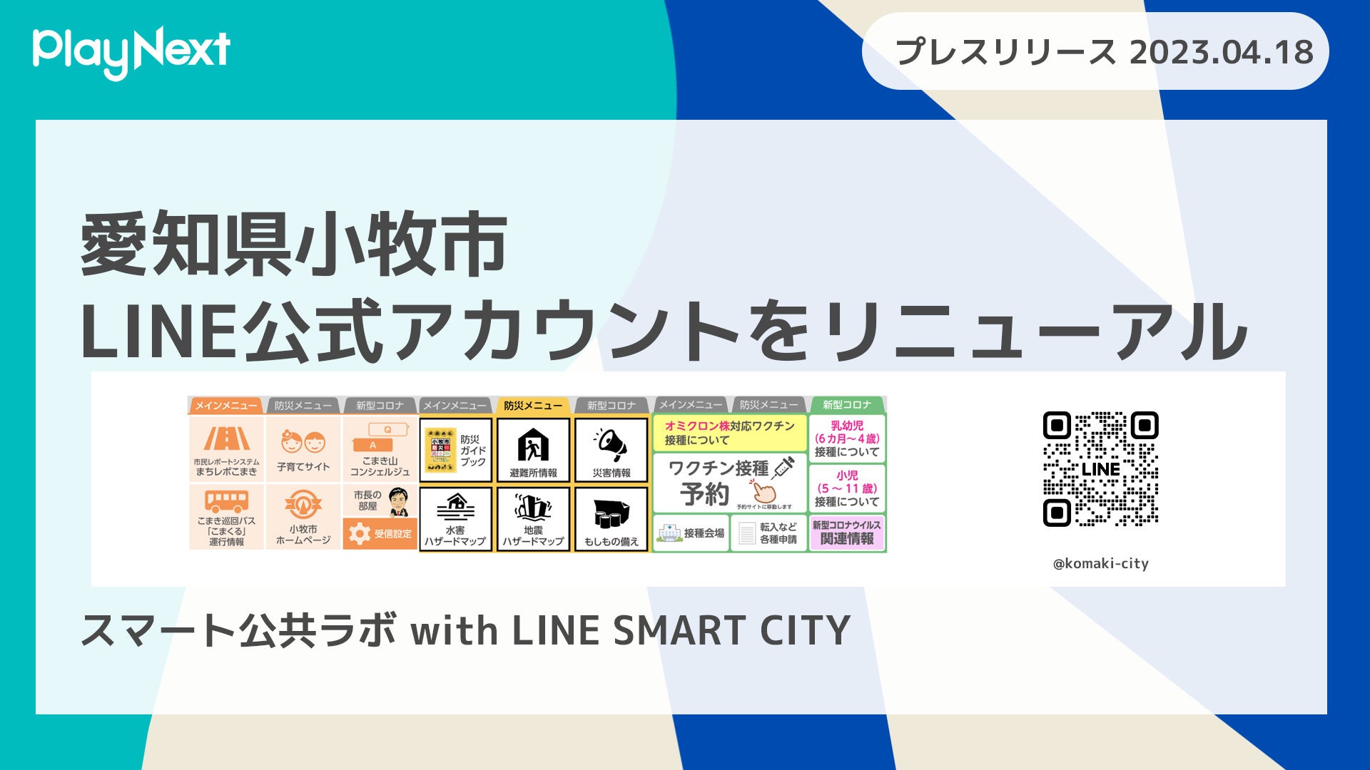 プレイネクストラボ株式会社(本社:東京都品川区、代表取締役:柏 匠、以下 プレイネクストラボ)は、「スマート公共ラボwith LINE SMART CITY GovTechプログラム」を活用し、愛知県小牧市(以下、小牧市)のLINE公式アカウントのリニューアル支援をいたしました。