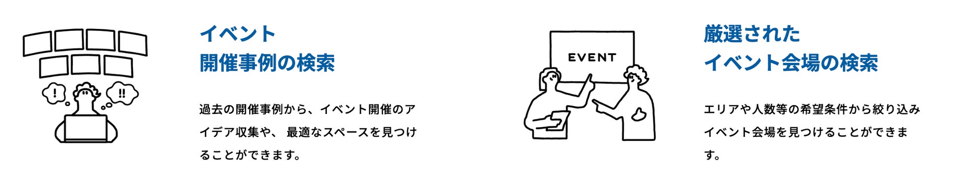 イベント開催事例の検索だけに捉われず、エリア・人数での掛け合わせ検索等、さまざまな検索体験を用意しています。