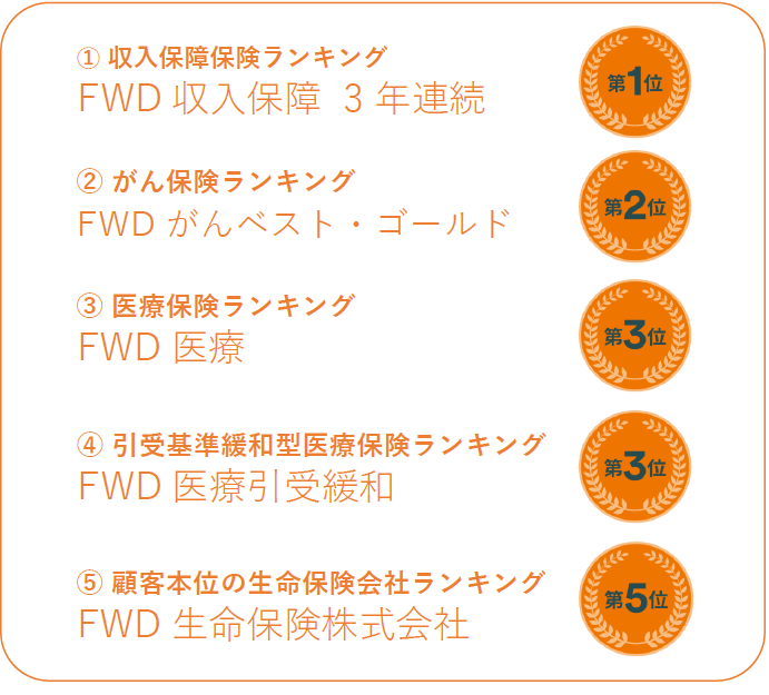 2022年1月4日に発表されたオリコン顧客満足度®調査において、収入保障型生命保険商品ランキングで『FWD収入保障』が1位、また生命保険ランキングで当社が生命保険会社として3位に選ばれました。FWD生命に関してより詳しく知りたい方は、https://www.fwdlife.co.jpをご覧ください。