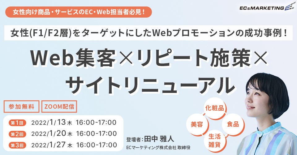 Webマーケティング支援サービスを展開しているECマーケティング株式会社((本社:東京都港区 代表取締役社長:中山高志)は、女性向け商品・サービスを扱っている企業様向けに「女性をターゲットにしたWebプロモーションの成功事例」と題したウェビナーを、1月13日・20日・27日の計3回、開催いたします。