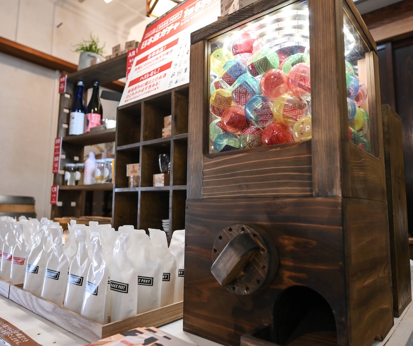 木製のSAKEPOSTガチャをまわすと、日本酒と酒器の組み合わせが必ず当たります。