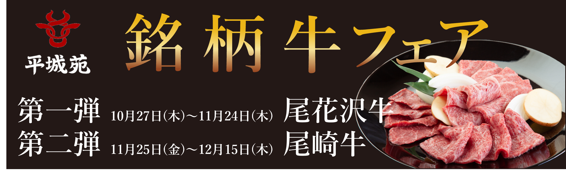 コロナ禍により飲食店だけでなく、全国の和牛生産者も非常に厳しい状況が続いている中、当社では、和牛の流通を活性化させ、より多くの方に美味しくて価値ある和牛を食べていただくために、この度、全国の産地から平城苑が厳選した希少な和牛を味わえる『銘柄牛フェア』を開催いたします。第一弾の10月27日(木)~11月24日(木)は山形県・尾花沢牛を、第二弾の11月25日(金)~12月15日(木)は宮崎県・尾崎牛を使用した限定メニューを販売します。またその土地の地酒もお楽しみいただけます。