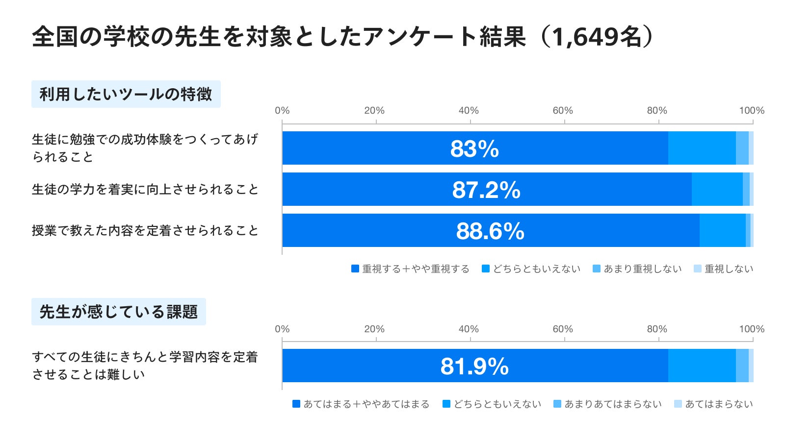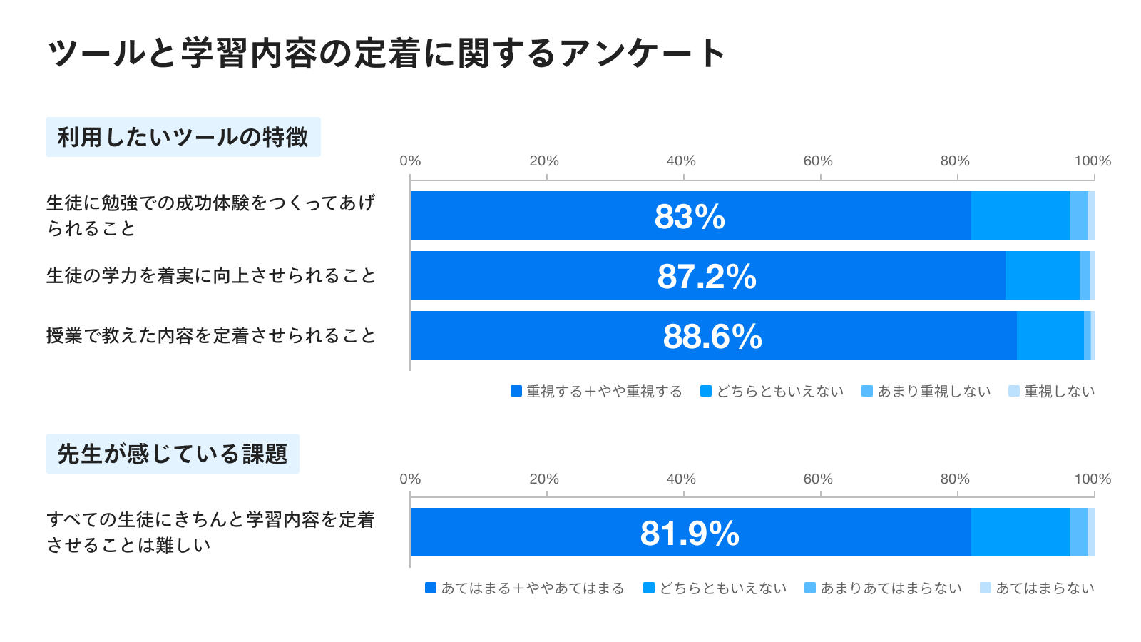 - 調査の結果、80%以上の先生が学習内容の定着の重要性を感じている結果に