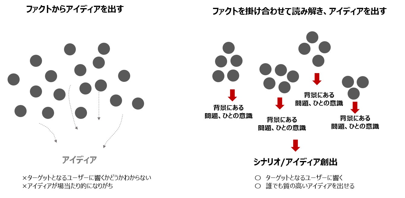 図は、情報(ファクト)をそのままリソースとしてアイディアを出す場合と、ファクトを読み解き、仮説を構築したうえでアイディア創出をした場合の比較です。