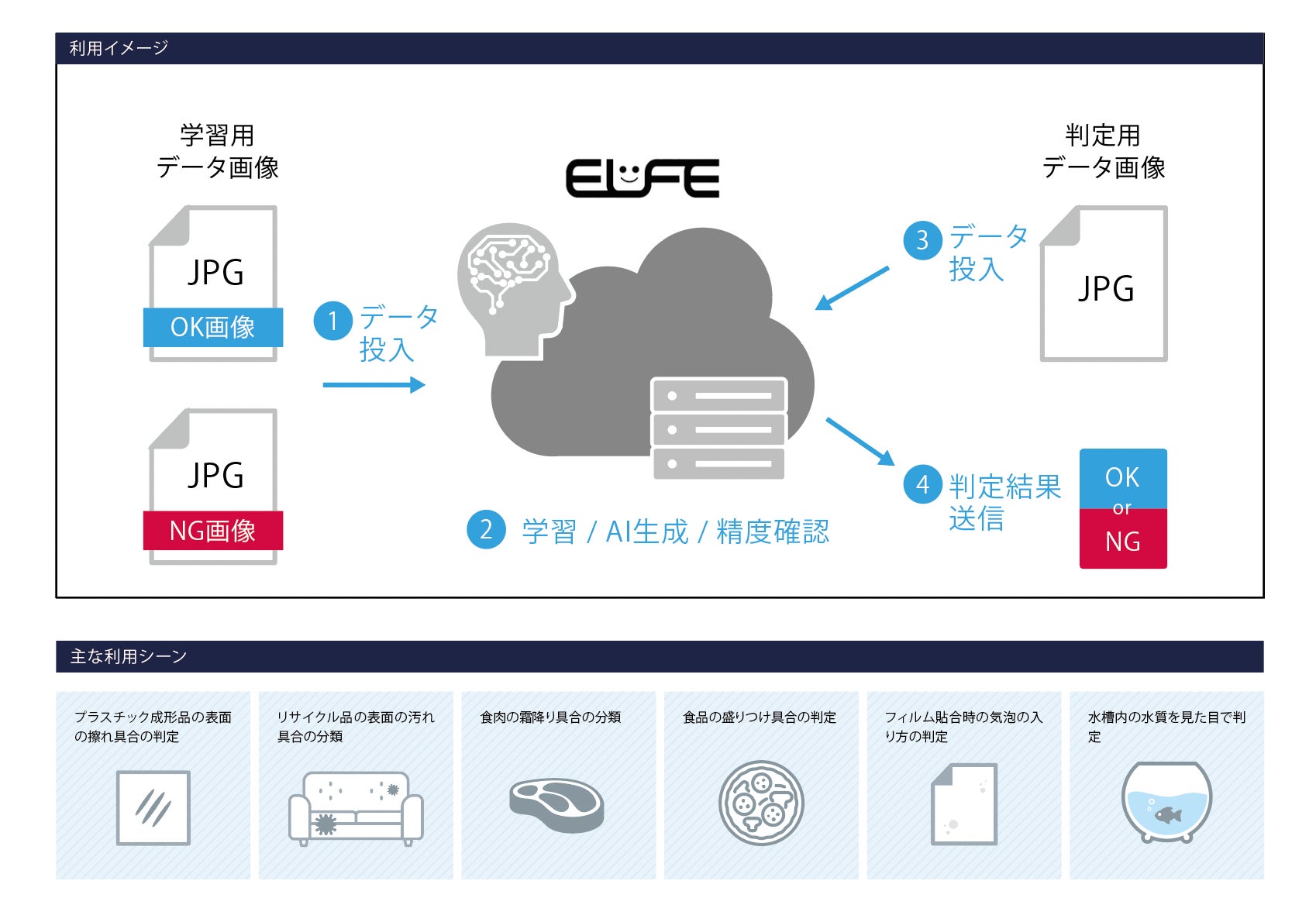 ELFEは判別モデルを自動開発する技術「Evolutional Learning for Feature Extraction」を採用した画像判別AIソリューションです。ソニー独自開発技術により、一般的な開発手法と比較して1/100程度の教師データでのAI開発を実現します。またデータをアップロードするだけでAIを自動生成できるため、AI初学者の方でもノーコードで開発が可能です。