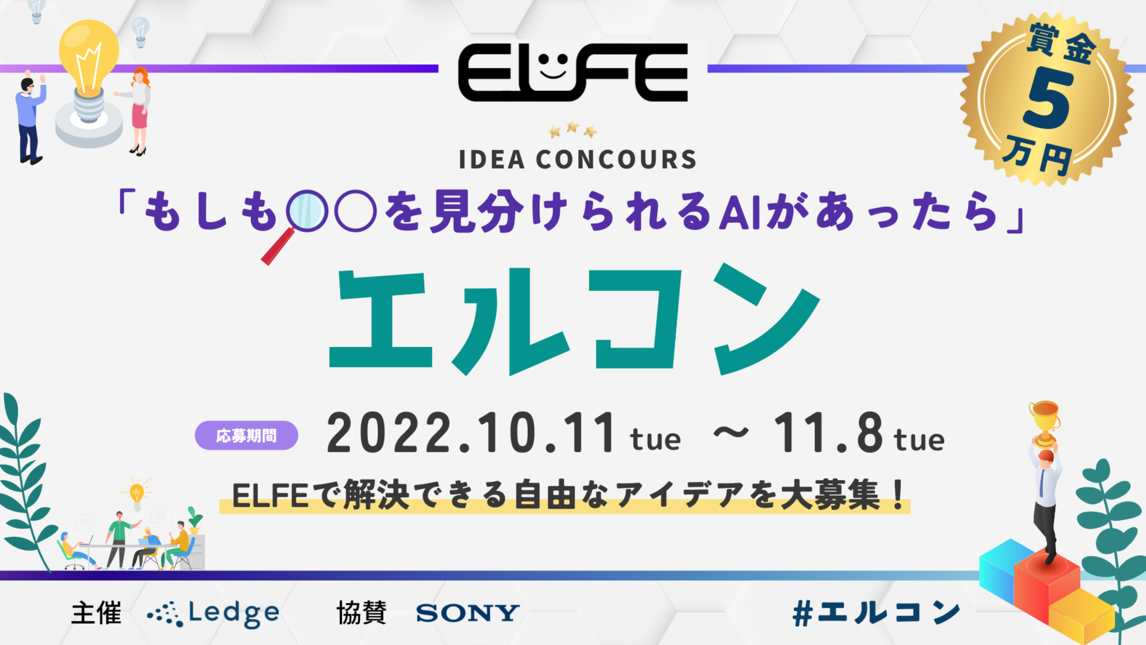 「AIをはじめとする最先端テクノロジーを社会になめらかに浸透させる」をミッションに掲げ、国内最大級のAI特化型ウェブメディア「Ledge.ai」を運営するほか、AIソリューションの企画・開発を行う株式会社レッジは、ソニーネットワークコミュニケーションズ株式会社、ソニービズネットワークス株式会社の協力のもと、画像判別ソリューション「ELFE」を用いた新しいアイデアを募集するコンクールイベント「エルコン」を2022年10月11日(火)から2022年11月8日(火)の期間で開催します。
