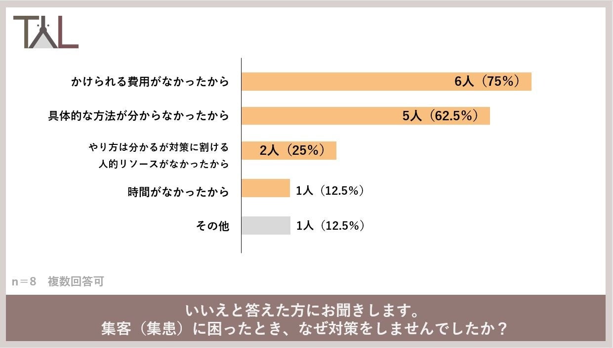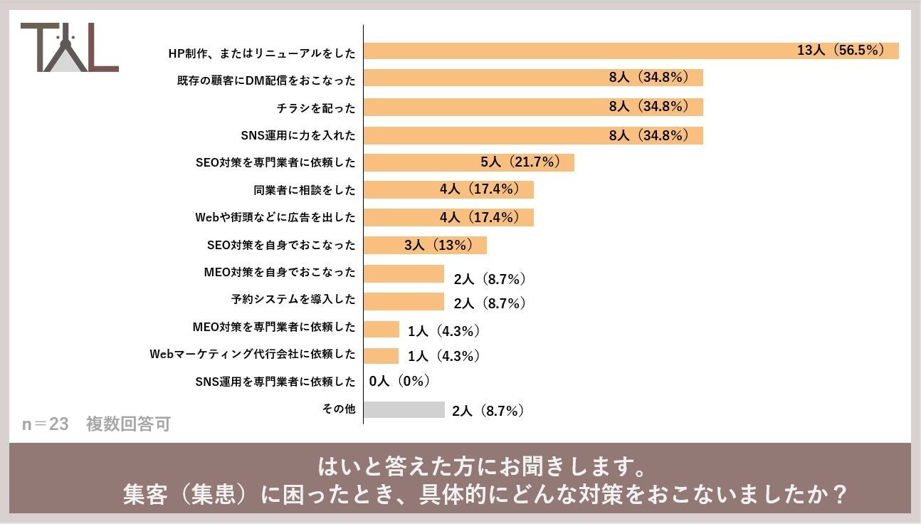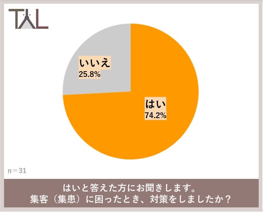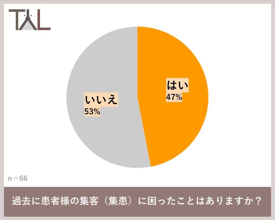 動物病院の院長66名に対し、「過去に患者様の集客(集患)に困ったことはありますか?」と質問したところ、はいと答えた人が47%、いいえと答えた人が53%という結果になりました。「はい」と答えた31名に対し、「集客(集患)に困ったとき、対策をしましたか?」と質問したところ、はいと答えた人が74.2%、いいえと答えた人が25.8%という結果になりました。さらに、「はい」と答えた23名に対し、「集客(集患)に困ったとき、具体的にどんな対策をおこないましたか?(複数回答可)」と質問したところ、1位「HP制作、またはリニューアルをした」、2位が同率で、「既存の顧客にダイレクトメール送信をおこなった」/「チラシを配った」/「SNS運用に力を入れた」という結果でした。「いいえ」と答えた8名に対し「集客(集患)に困ったとき、なぜ対策をしませんでしたか?(複数回答可)」と質問したところ、1位は「かけられる費用がなかったから、2位「具体的な方法が分からなかったから」、3位「やり方は分かるが対策に割ける人的リソースがなかったから」という結果になりました。