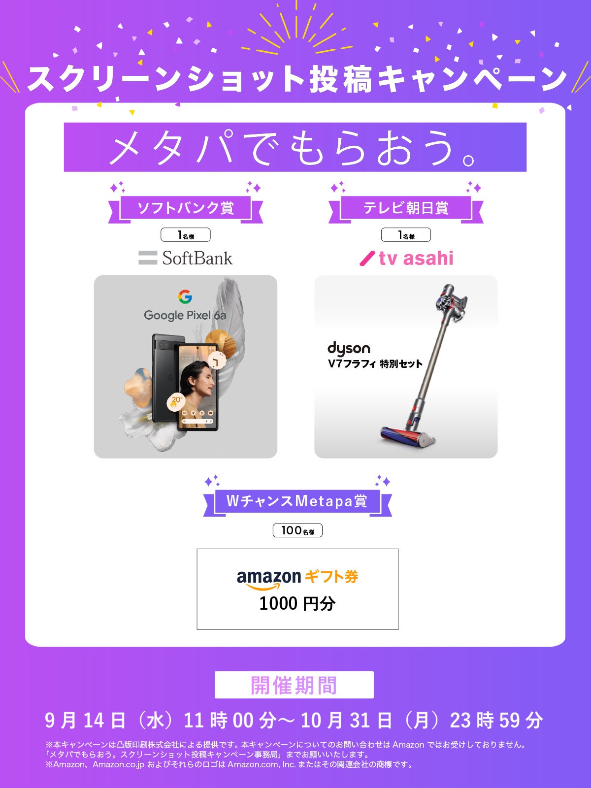 株式会社テレビ朝日(以下 テレビ朝日)、ソフトバンク株式会社(以下 ソフトバンク)、凸版印刷株式会社(以下 凸版印刷)は、凸版印刷が提供するメタバースモールアプリ「メタパ®」にて「メタパでもらおう。スクリーンショット投稿キャンペーン」を開催中。
