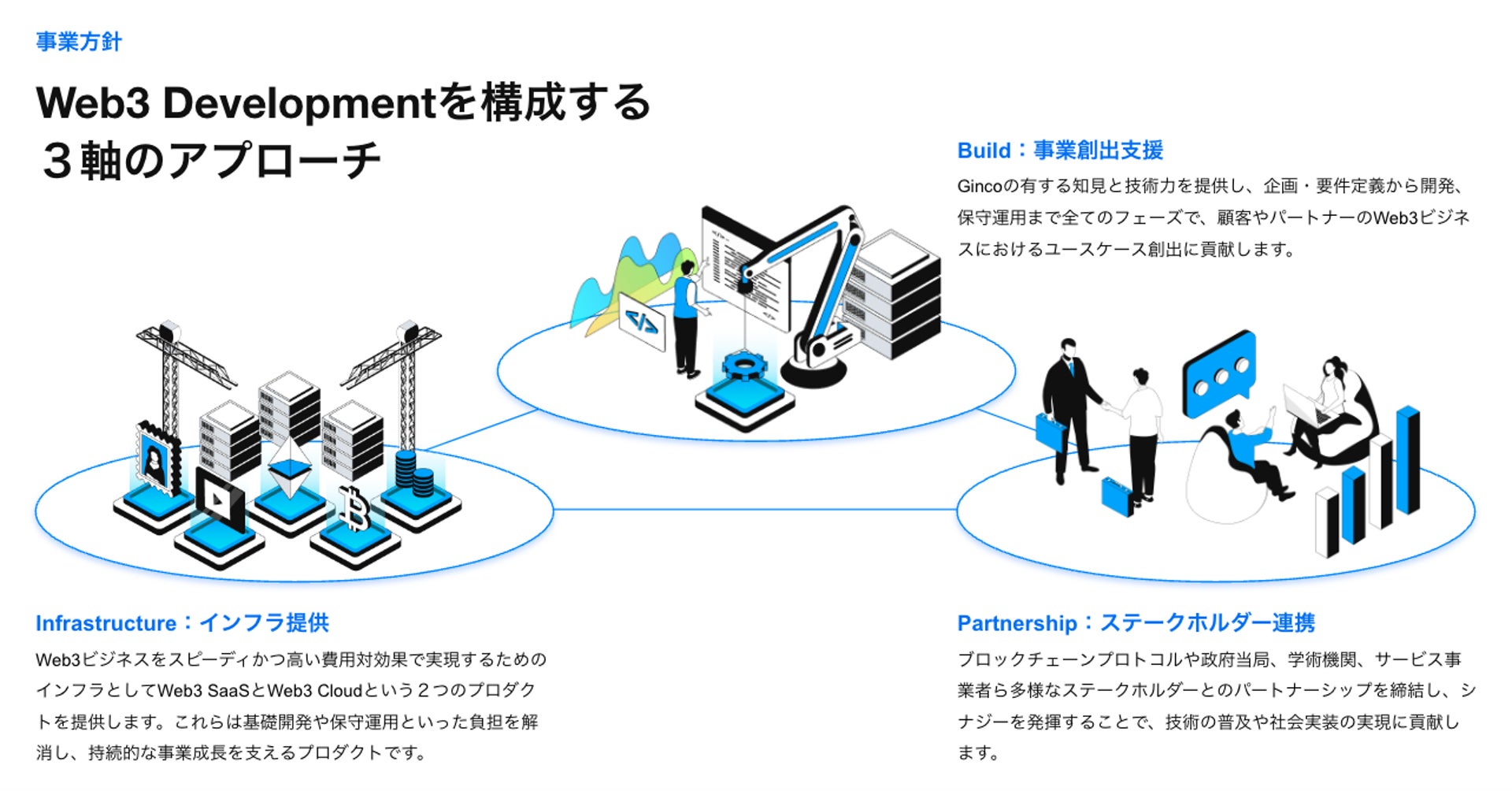 このような背景から、これまでインフラ開発を通じて培ってきた3つの視点「Build」「Partnership」「Infrastructure」を軸に、企業のWeb3ビジネスの要件定義から成長支援までを総合的にサポートする並走パートナーとしての存在価値を発揮するため、ブランドタグラインを「Web3 Development Company」へと一新することとしました。