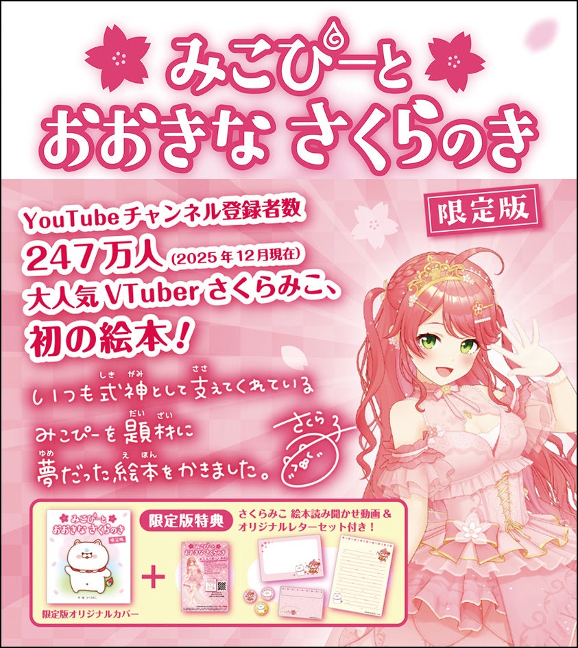 株式会社フレーベル館(本社:東京都文京区、代表取締役社長:吉川隆樹、以下フレーベル館)は、ホロライブ所属VTuber・さくらみこ先生による初の絵本『みこぴーと おおきな さくらのき』を、2026年3月5日(木)より全国の書店およびネット書店にて発売いたします。また、数量限定で『みこぴーと おおきな さくらのき 限定版』も発売いたします。