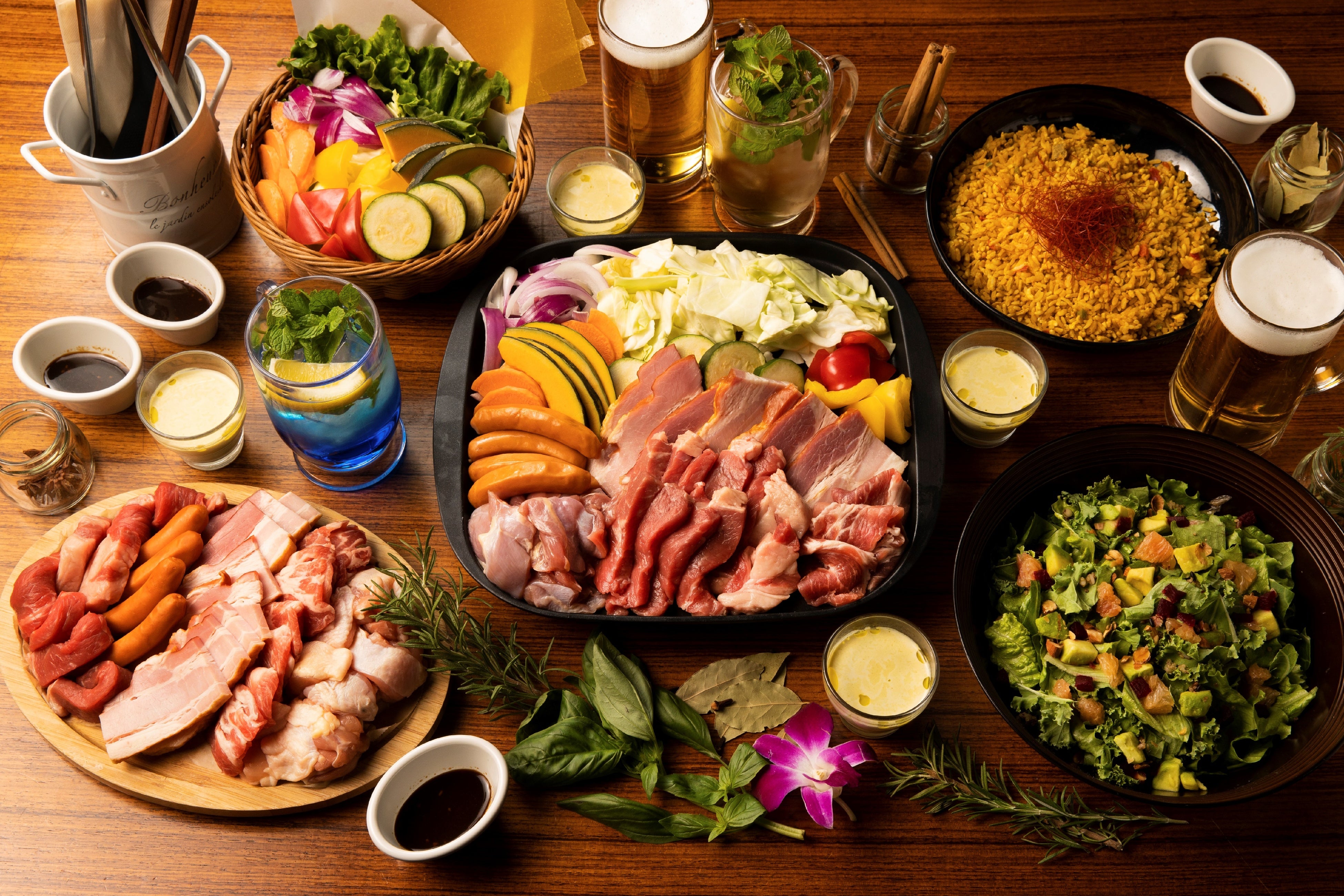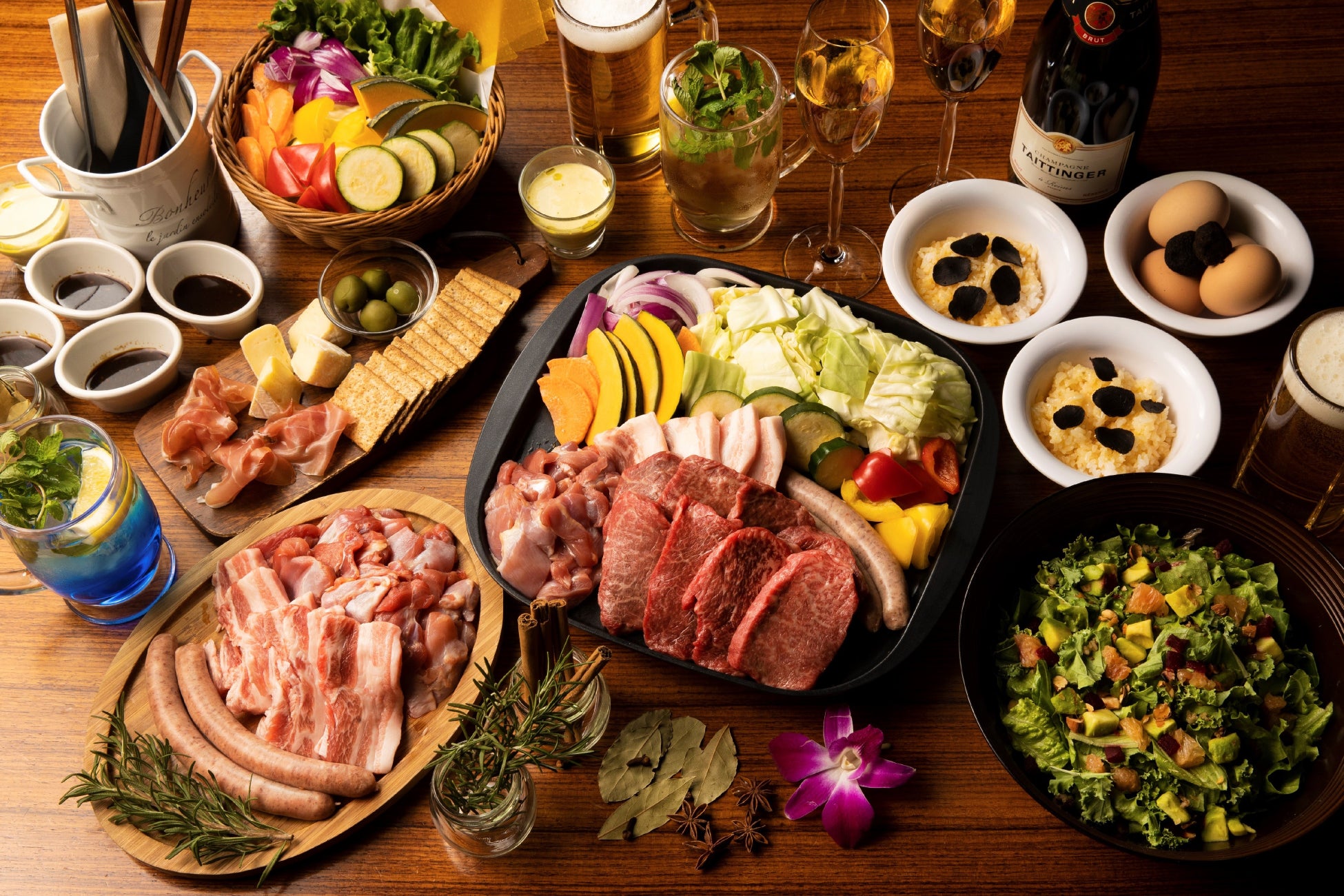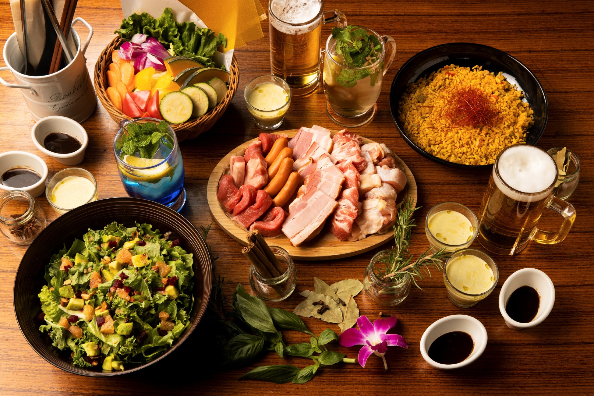 ▼プレミアムBBQ「ミートパワープラス」コース お⼀⼈様¥15,000(税込)150分飲み放題付