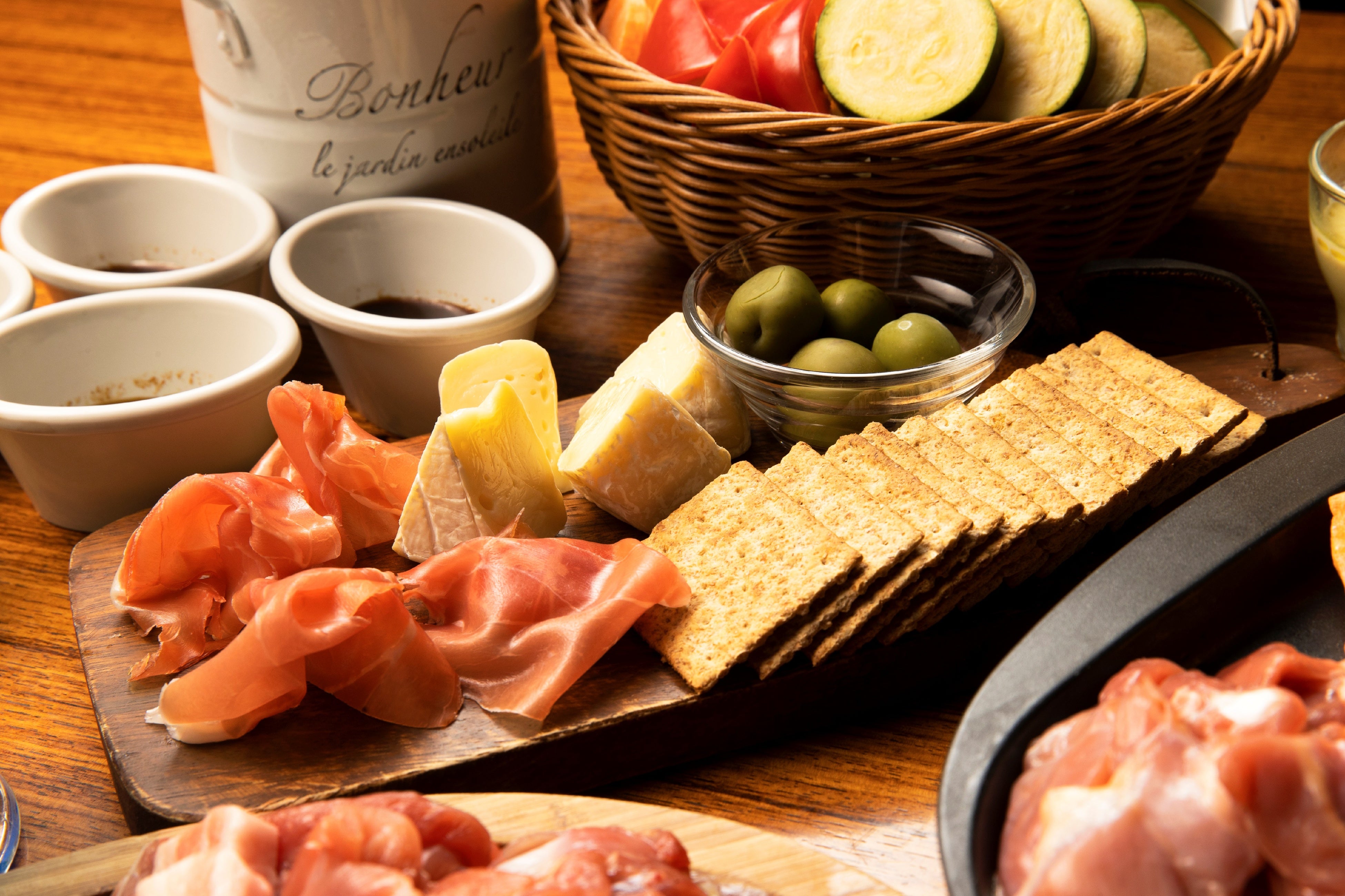 ・前菜 生ハム、チーズ、オリーブのカナッペ