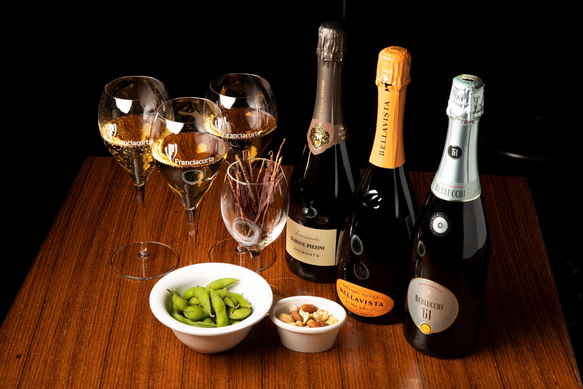 涼しくなった夜風を感じながら、ウォークインでも気軽にイタリア最高峰のスパークリングワイン「フランチャコルタ」の飲み比べができるバーも用意。