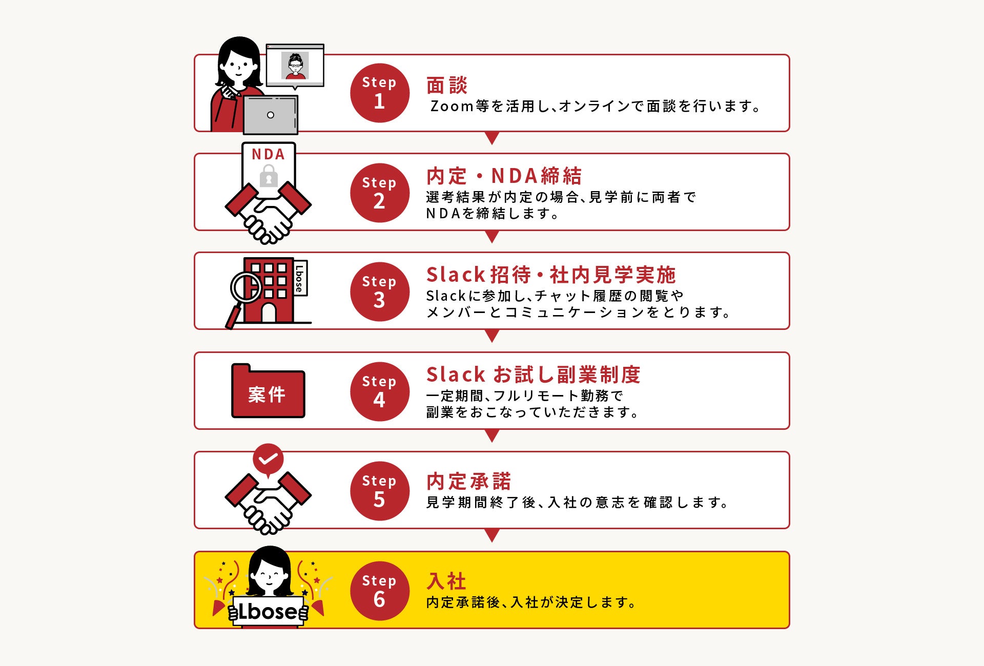 Slackお試し副業制度は、現在他の企業にお勤めの方が、Lbose社内のSlack上で一定期間フルリモートで副業を行う制度です。Slack会社見学実施後※に副業を行っていただくことで、さらに採用のミスマッチを減少させる狙いです。