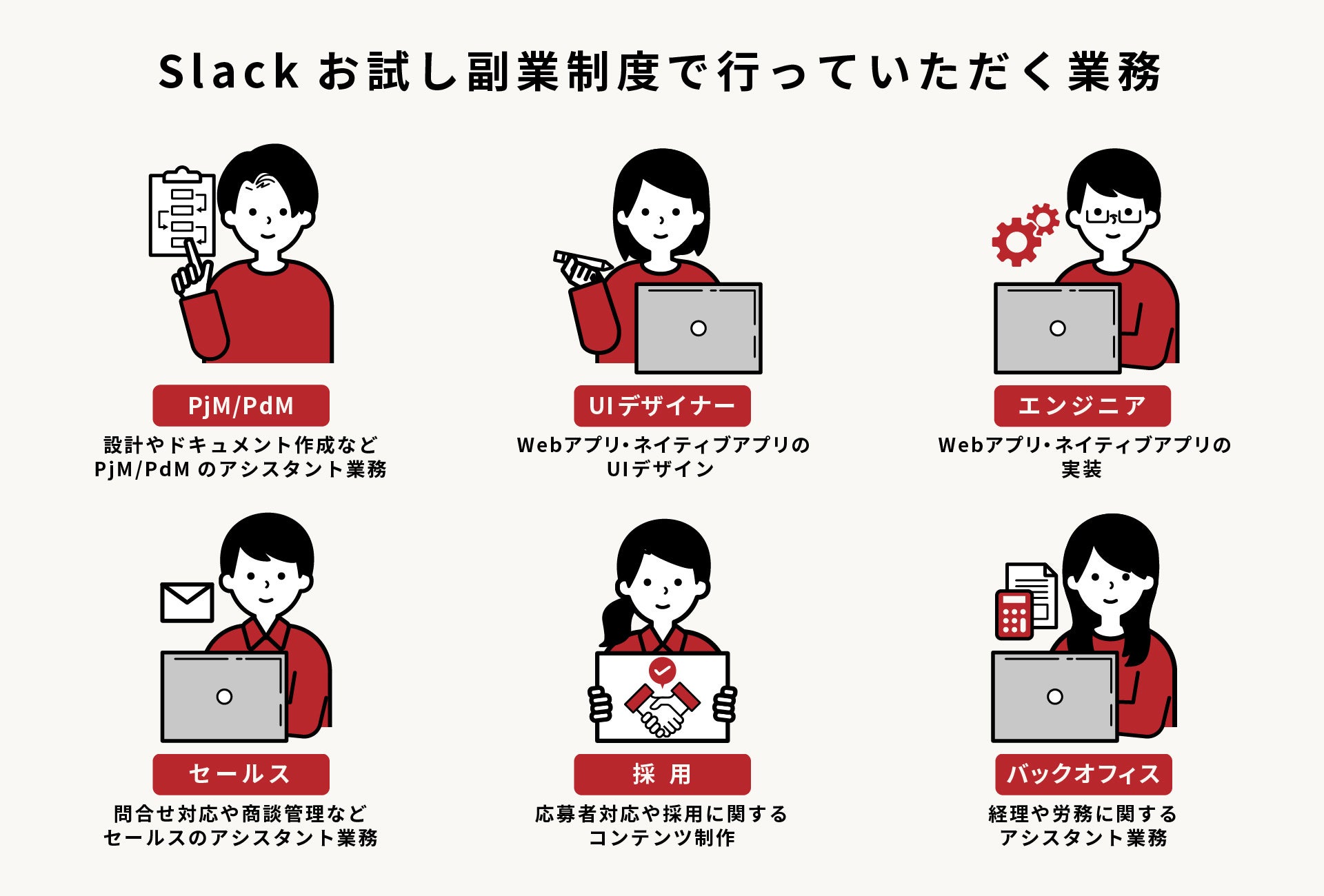 オンライン採用の課題を解消するために私たちが開始した「Slack会社見学制度」は、リリース以降多くの方から反響をいただき、利用者も増加しました。一方で利用者の多くは完全フルリモート企業での勤務経験がなく「お試しで勤務を行うことでより理解を深めたい」といった声もあったため、本取り組みの実施に至りました。まずは6つの業務に絞ってお試し副業を実施します。