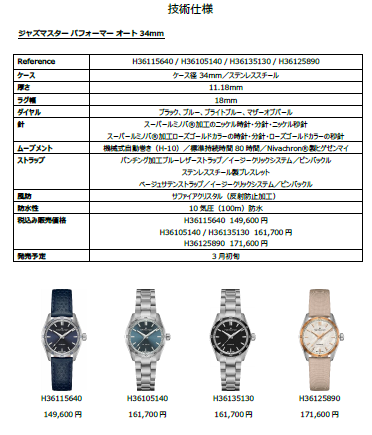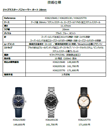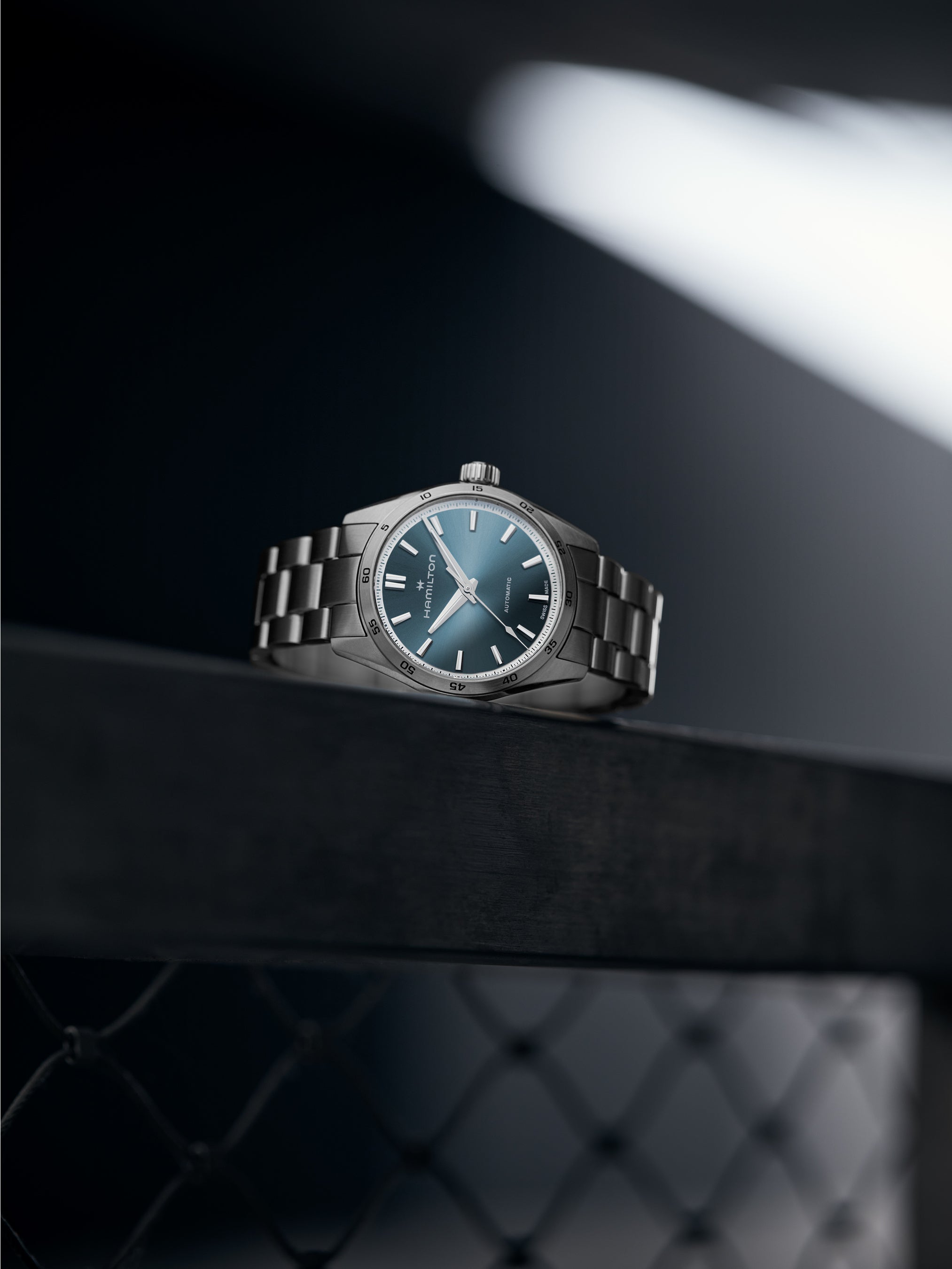 あらゆる場面を想定し作られたスタイリッシュなタイムピースには、ステンレススチール製ブレスレットまたはパンチング加工を施したレーシングスタイルのレザーストラップが組み合わせられ、コレクションのダイナミックなエッセンスを表現します。10気圧(100m)防水とねじ込み式リューズを備える「ジャズマスター」は、人生のあらゆる冒険に最適なパートナーです。