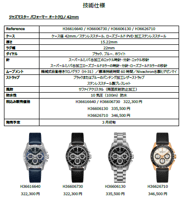 42mmの「ジャズマスター パフォーマー オートクロノ」を駆動するのは、非磁性補正合金Nivachron™製のヒゲゼンマイを採用した標準持続時間60時間のH-31自動巻きクロノグラフムーブメントです。