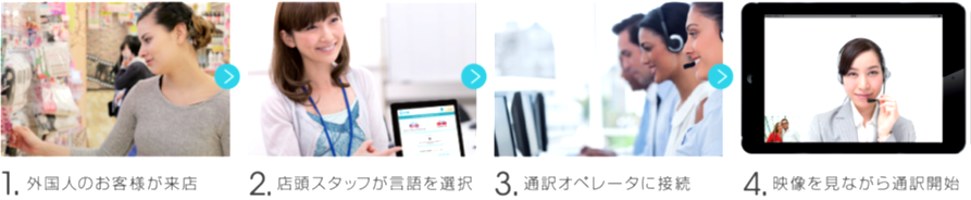 「みえる通訳」は、タブレットやスマートフォンを使って、いつでもどこでもワンタッチで、通訳オペレーターにつながり、お客様との接客をサポートする映像通訳サービスです。日本語と外国語が話せる専門の通訳オペレーターとFace to Faceでお互いの顔や表情を見ることで、微妙なニュアンスや機械では判別できない難しい内容でも会話することができます。