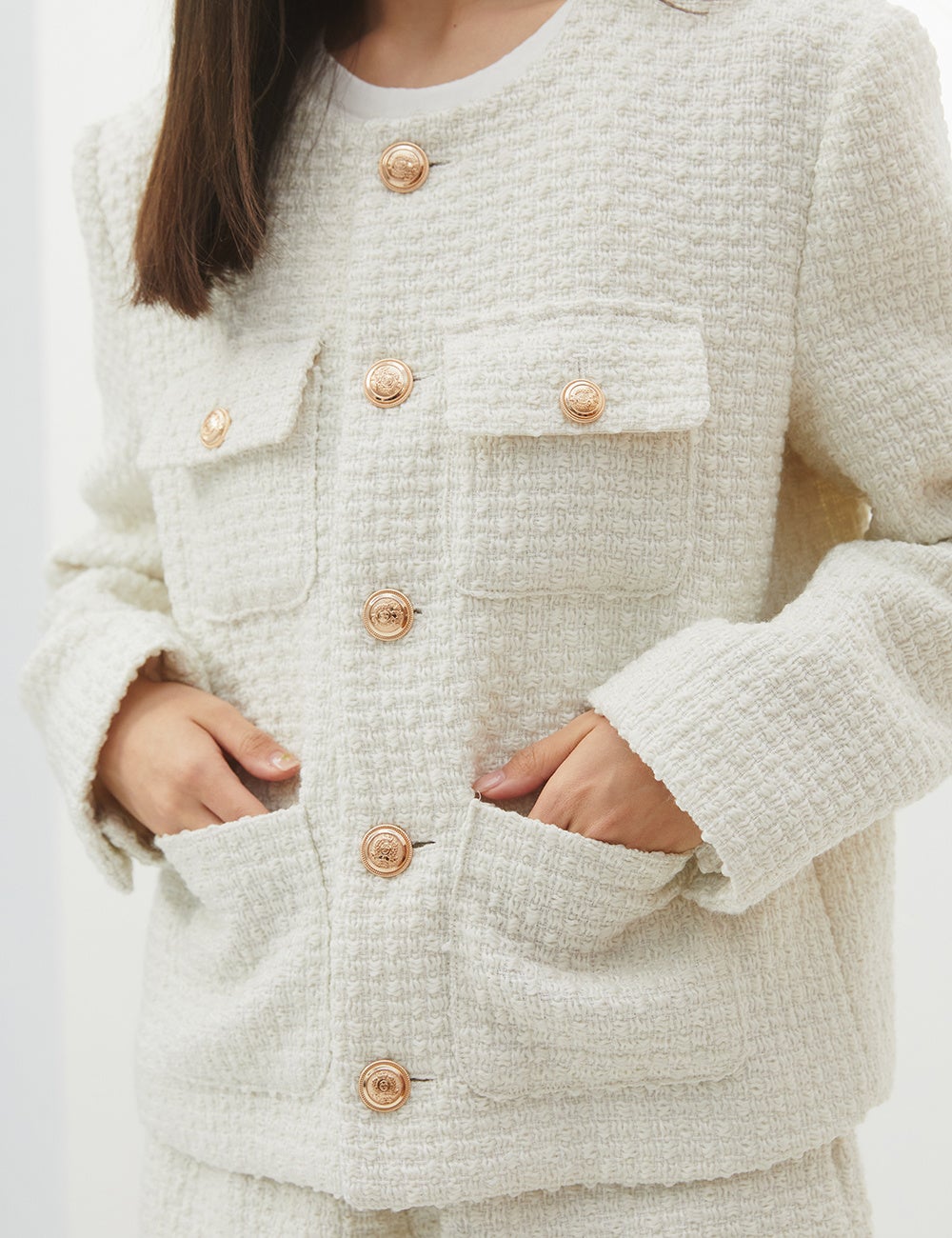 重厚感のあるツイード素材と、存在感のあるゴールドボタンであしらわれたツイードジャケット。