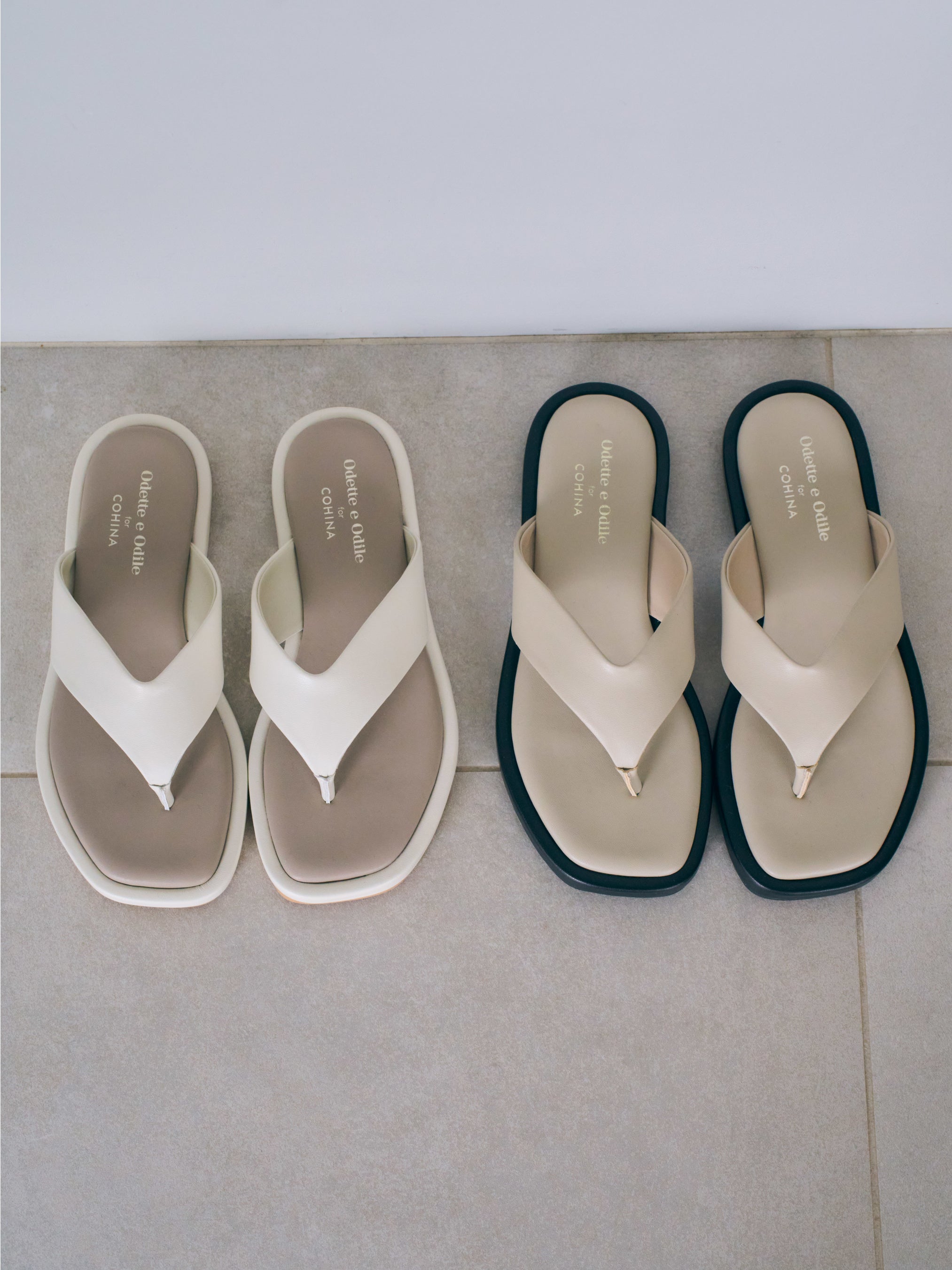この度、昨年9月に販売しご好評いただいたシュークローゼットブランド「Odette e Odile」との第2弾となるサイズおよびカラー別注コラボレーションが実現しました。 アイテムはフラットシューズとブロックヒールサンダル、トングサンダルの全3型。第2弾は21.0cm〜23.5cmと展開サイズが拡充し、かつ全てCOHINA別注カラーでお作りしました。中敷には「Odette e Odile for COHINA」と印字され、COHINA STOREでしか買えない特別なシューズです。