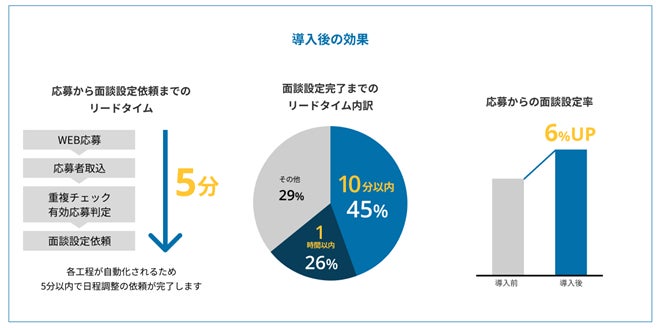 応募発生後に情報をリアルタイムで取り込み、5分以内に応募者へメールやSMSで面談設定URLを送信。応募発生から面談設定までの業務を自動化することで、面談設定までのリードタイム短縮と面談設定率向上へ貢献します。