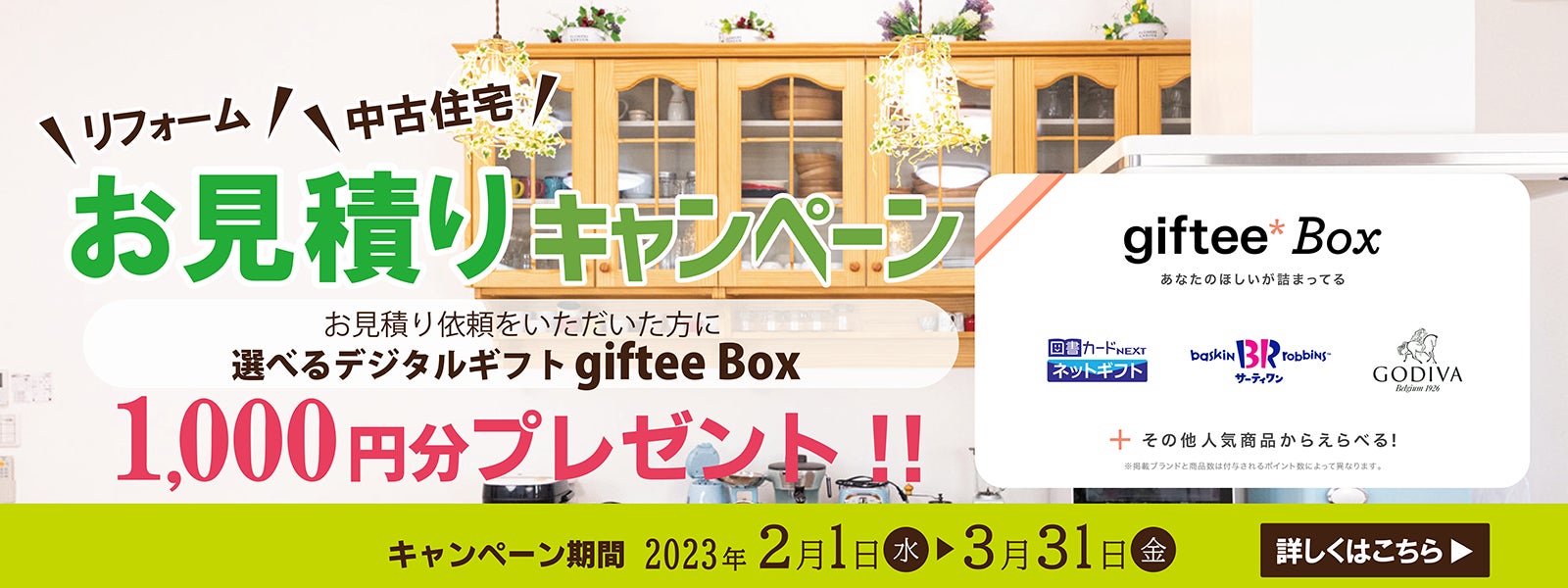 キャンペーン期間中に、リフォームのお見積り依頼をいただき、現地調査、お見積書を受け取られた新規お客様に、デジタルギフトgiftee Box 1,000円分プレゼント致します。リフォームしたいけど進め方が分からない、リフォーム会社の選び方が分からないなどの初めてのリフォームのサポートから、お住まいについてのお悩み、リフォームについてのご予算やご相談を、お客様のご要望をお伺いしたうえで、最適なご提案をさせて頂きます。是非この機会にご相談下さい。