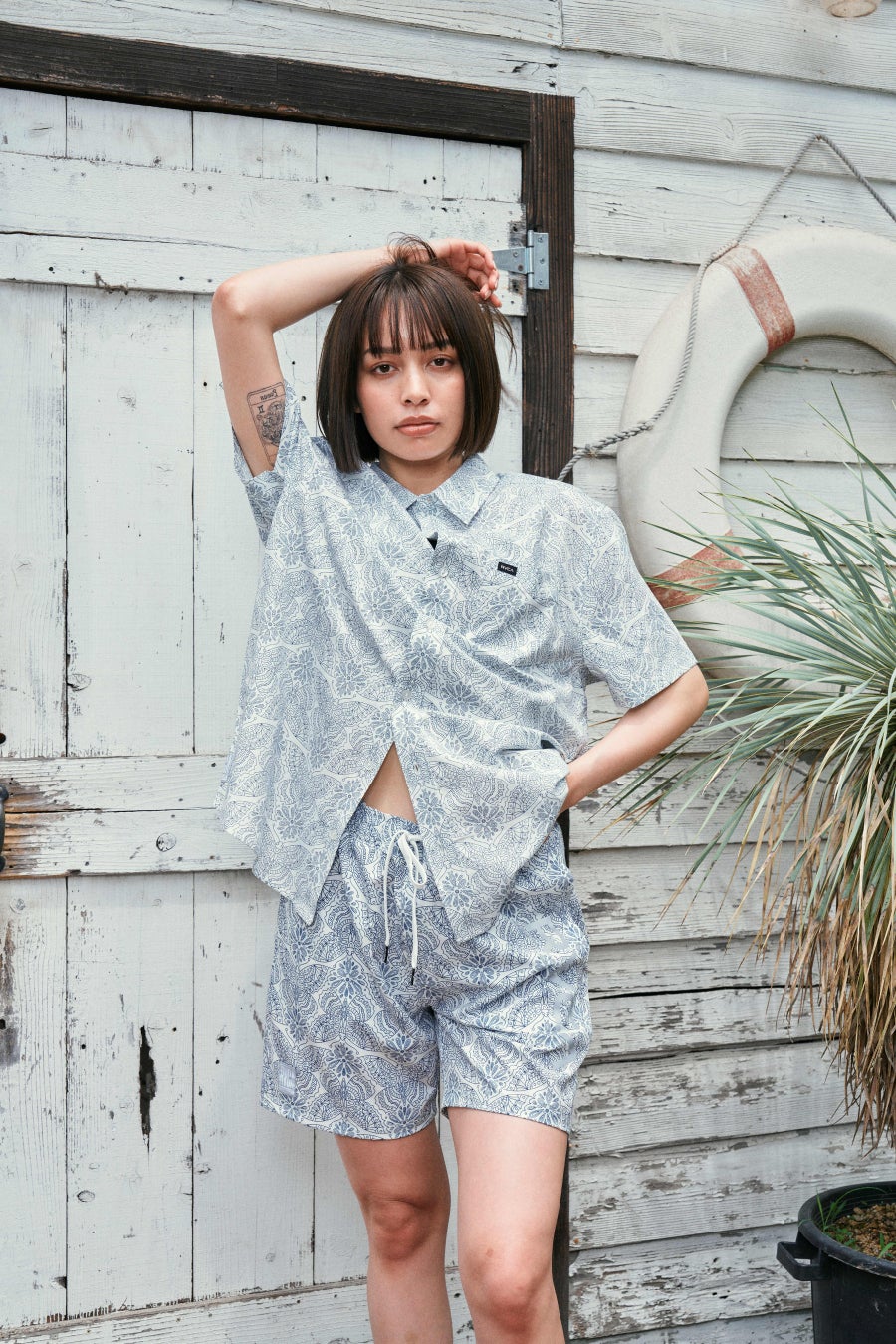機能性にも優れた“SURF TEE”シリーズは、速乾性とUVプロテクション(UPF50)を備え、ビーチやプールではトップスとして、トレーニングやアクティブなシーンでも活躍。まさにライフスタイルに寄り添うマルチユースな一枚です。さらに、水陸両用で着用可能なシャツ&ショーツのセットアップも登場。軽やかな素材と洗練されたデザインが融合し、アウトドアからタウンユースまで幅広く対応します。ファッション性と実用性を兼ね備えた、RVCA × AZUL BY MOUSSYの2025年夏コレクション。