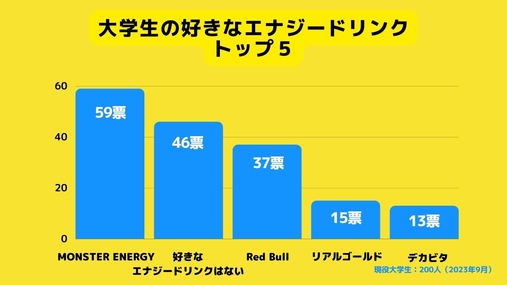いかがでしたでしょうか?大学生間では社会人が想像しているほど、エナジードリンクを愛飲していないことも分かりました。実際に⼤学⽣のデータで確認すると、リアリティのある感覚が掴めます。