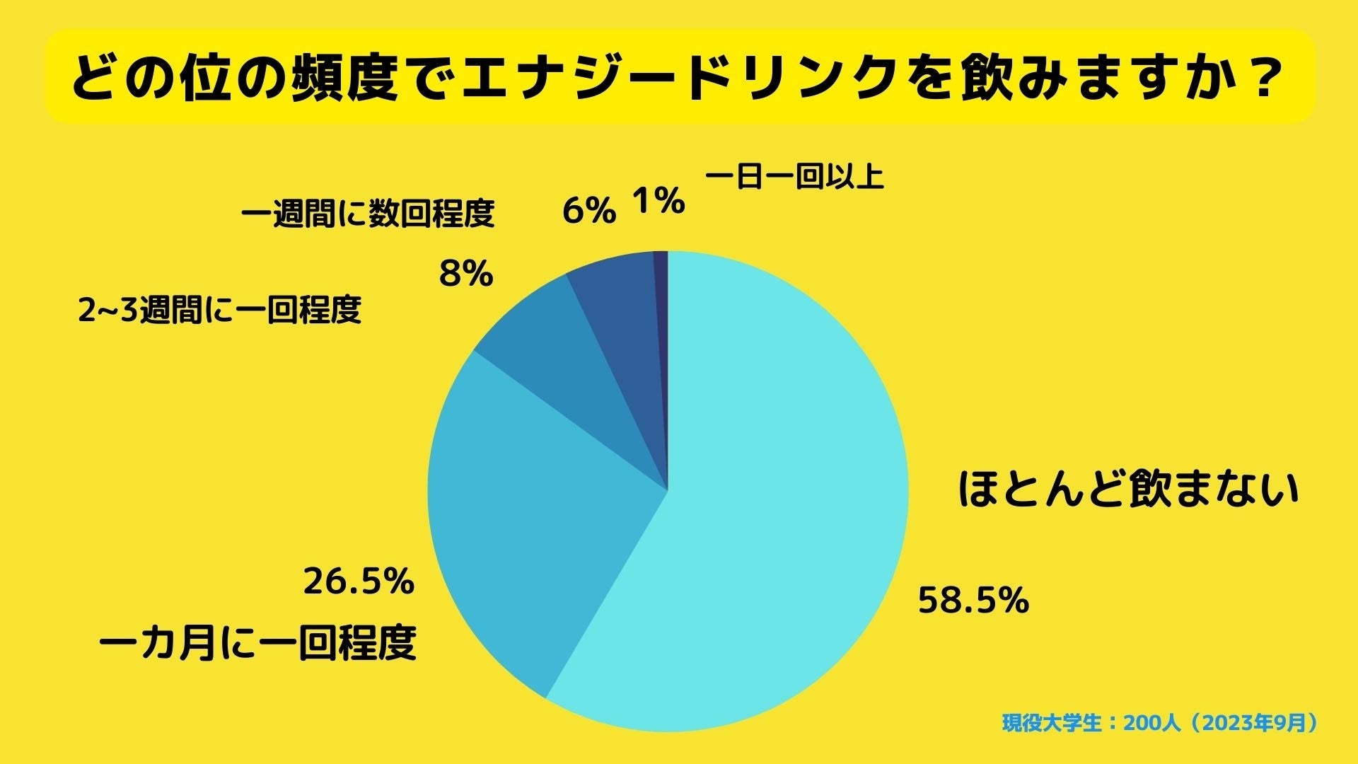 「エナジードリンクは若者の飲み物」というイメージが強いですが、調査結果からは、ほとんど飲まない大学生が約60%という結果に。次の多い頻度は「1カ月に1回程度」となりました。