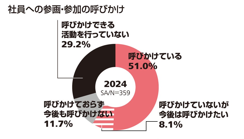 ■「呼びかけできる活動を行っていない」と回答した企業を除くと、「呼びかけている」および「呼びかけていないが今後は呼びかけたい」と回答した企業が大多数となる。