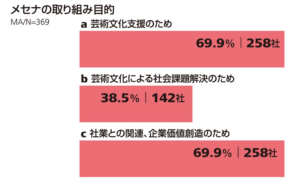 ポイント1. 企業によるメセナ活動の取り組み目的について、「社業との関連、企業価値創造のため」の回答数が「芸術文化支援のため」と同数となり、社業や自社の価値創造に資するメセナ活動の重要性が増している。