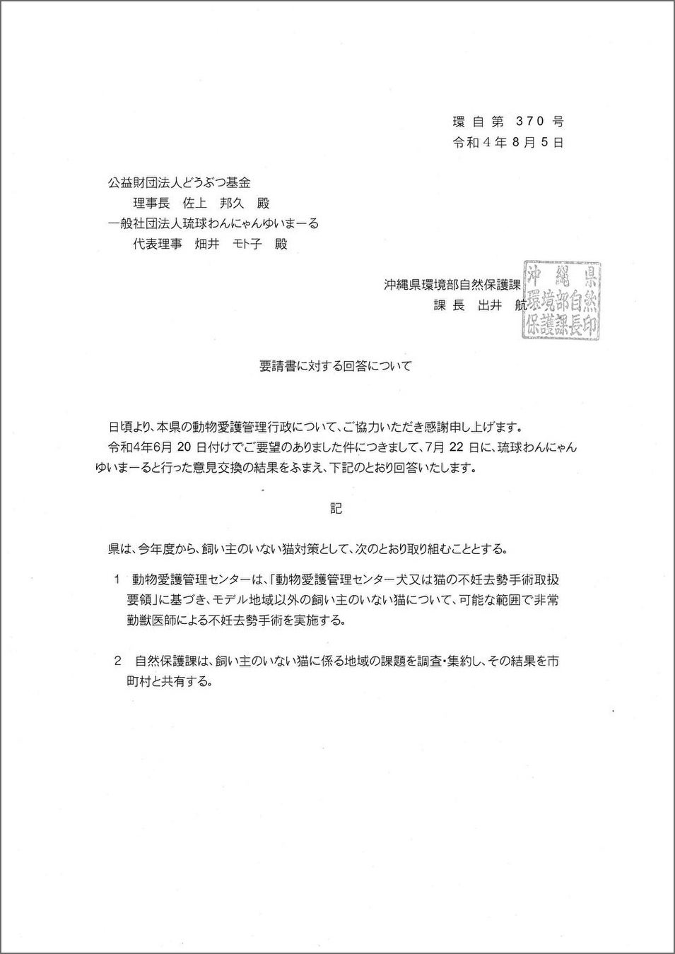 その後、現地関係者との意見交換を経て、8月5日付で沖縄県から正式に回答がありました。