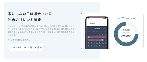 「帰らない日は家賃がかからないリレント」は、入居者が外泊時に自分の部屋をホテルとして貸し出すことにより家賃が外泊数に応じて減額するシステムです。
