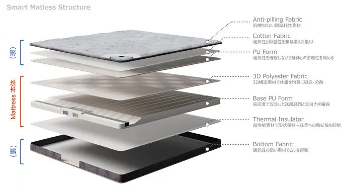 日本特有の高温多湿な四季、就寝中の発汗、冬場の結露……。これらによりマットレス内部は常に多湿状態にあり、カビやダニの温床となるだけでなく、寝具の寿命を縮める最大の要因となっています。また、エアコンによる温湿度管理だけでは「喉の乾燥」や「体感温度のムラ」が生じやすく、一年を通して理想的な睡眠環境を保つことは困難でした。